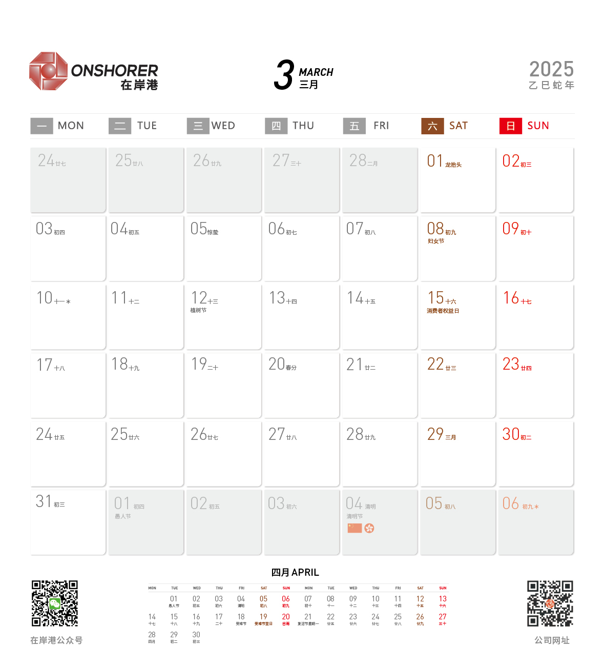 关键的假期或特别的日子(包括农历忌日)都标注在每个月相应的日期上。
